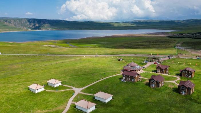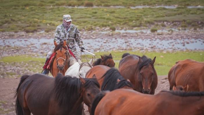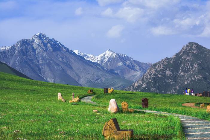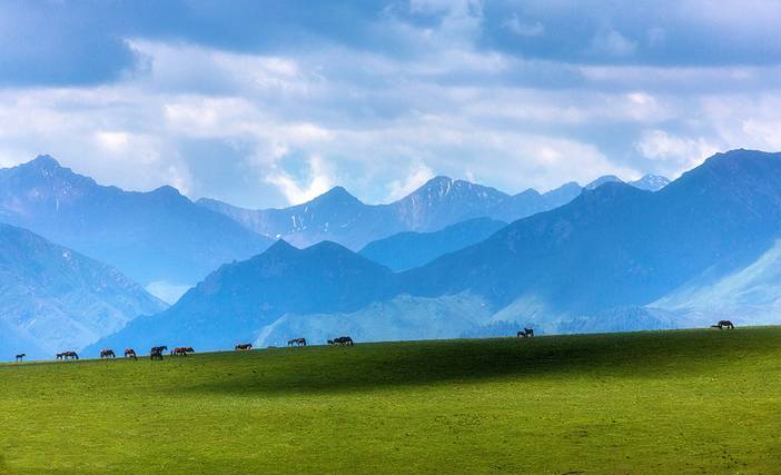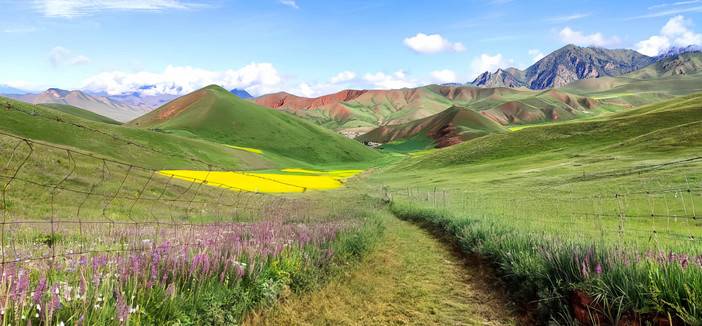 沿途河流蜿蜒流淌,映照着万千风景,阳光透过云层,天空湛蓝透明仿佛能摸到它的边缘。远处山峦高耸,像巨人守护一方平安。我们缓缓行走其间,你会找到内心的宁静和前所未有的安全感,人与自然的界限变得模糊。每一位淳朴的牧民,可爱的牛羊,盛开的野花,都能轻易驱散你所有的焦虑和不安,带来洗礼与重生。