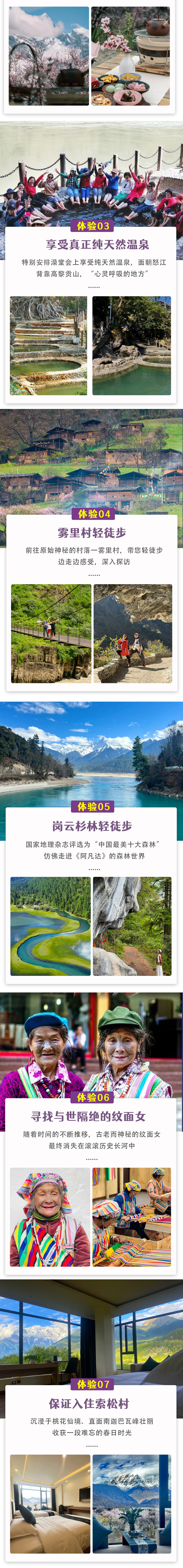 游览重点:怒江大峡谷、老姆登晨景、皇冠山、知子罗、石月亮、普卡旺村、龙元村、纹面女