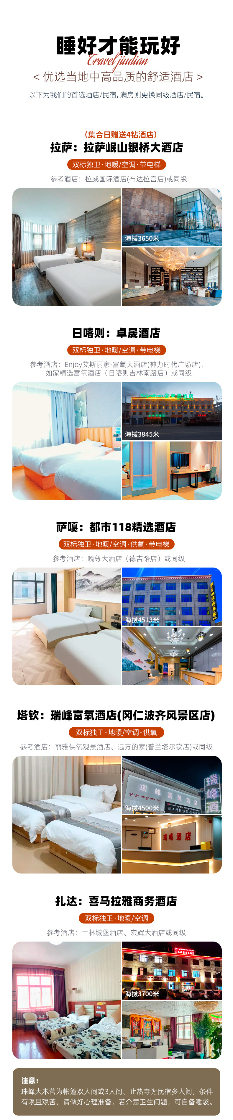(1)我社为队员们提供了性价比高的住宿,尽管如此,队员们应该有充分的心理准备,阿里线沿途人烟稀少,基础建设有限,沿线酒店多未评定星级,因处于高原地带,水、电资源缺乏,有时候也会遇到停水、停电的情况,请提前准备好手电筒,要做好不能洗澡、洗头、洗脸的准备,特别爱干净的队员,可以携带睡袋内胆,以备不时之需;