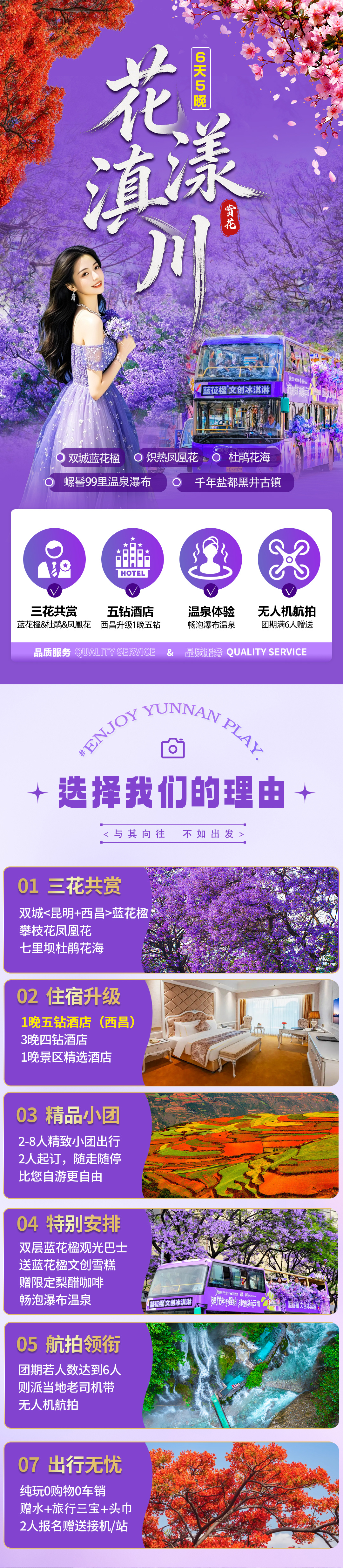 <昆明&西昌>双城蓝花楹、东川红土地、元谋土林、攀枝花凤凰花、大石板村、螺髻99里温泉、七里坝杜鹃花海、黑井古镇、富民蓝花楹6日游(2-8人轻奢小团 | 满6人赠送航拍 | 升级1晚5钻酒店 | 梨醋咖啡 | 蓝花楹双层观光巴士+文创雪糕 | 畅泡瀑布温泉 | 烟斗老人摆拍)