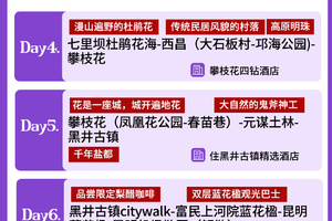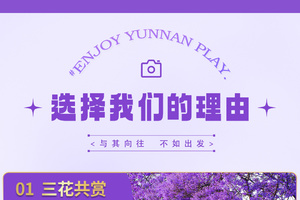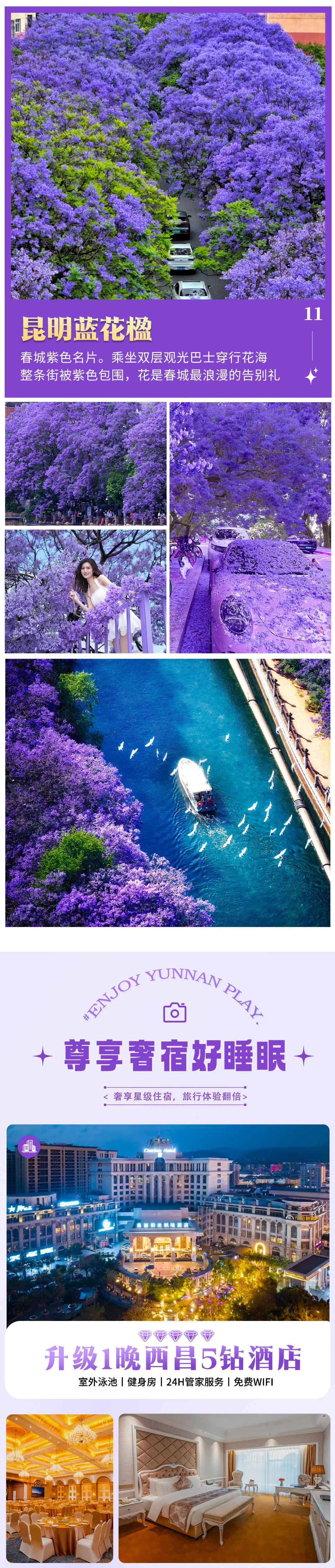 全天昆明市区酒店报道。如果抵达时间早的,可以自行到海埂大坝附近逛逛,那边有云南民族村景区和西山国家风景区,从民族村可以坐索道上去到西山风景区,到风景区龙门可以远眺整个滇池和大片昆明市区,风光很美。还可到翠湖公园附件逛逛陆军讲武堂,翠湖南门也有一些蓝花楹可以欣赏;去南屏步行街品尝当地最特色的汽锅鸡或过桥米线,也可品尝关上野生菌火锅等特色美食;春城路和宝海公园等其它昆明10余处,也满是“蓝紫色”的身影,处处是它尽显绰约风姿的舞台。酒店可全天办理入住手续哦。