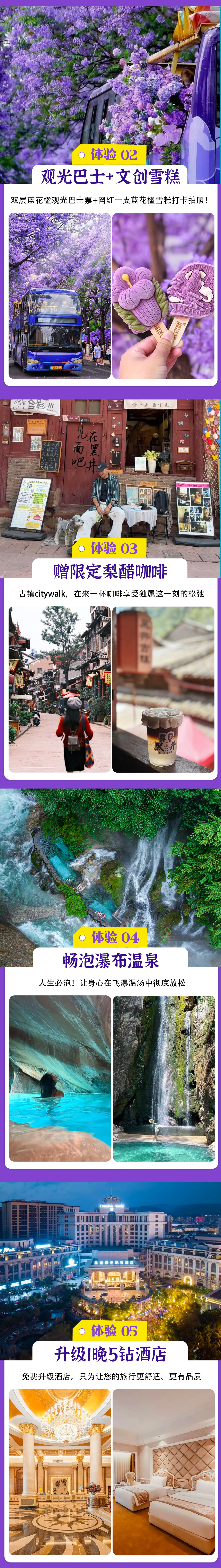 【旅行体验】:特别安排昆明双层蓝花楹环线观光巴士票+每人网红一支蓝花楹雪糕打卡拍照+黑井盐都限定梨醋咖啡一杯+99里网红温泉票;
