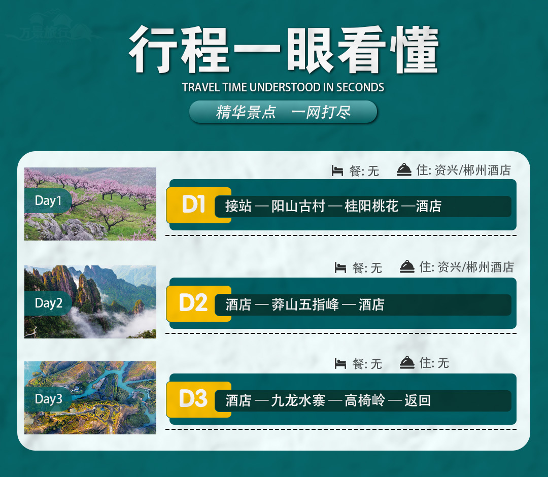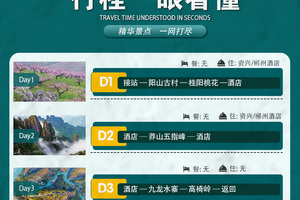 景点:桂阳桃花,莽山五指峰电瓶车,九龙水寨竹筏,高椅岭