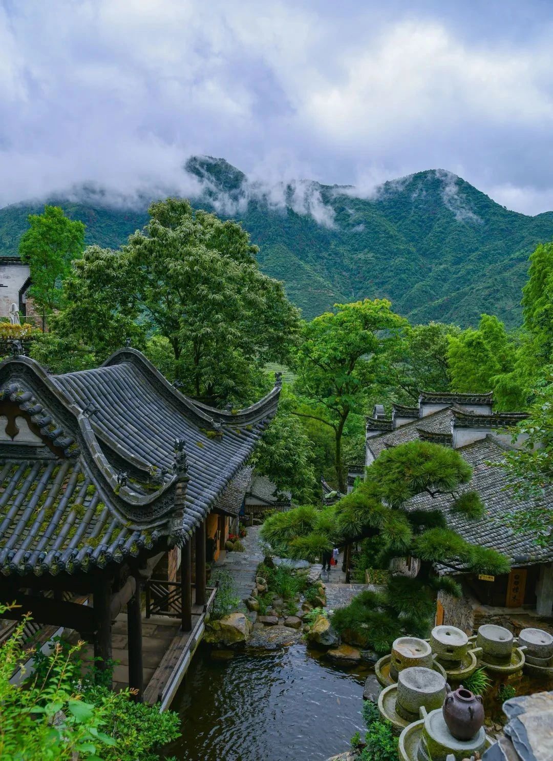 一蓑烟雨梦徽州,青砖黛瓦马头墙。春日的雨时断时续,远处的山若隐若现,雾衬着山来回游动,这就是篁岭上的烟雨徽州人家
