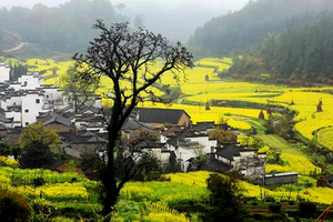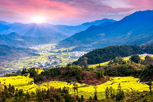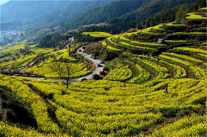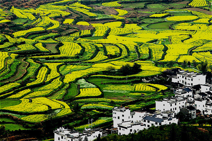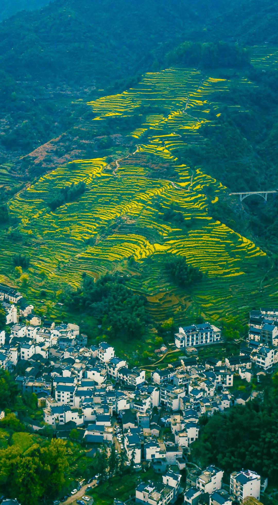 江岭漫山遍野的油菜花呈梯田状,从山顶铺散到山谷下。站在山顶望去,油菜花层层叠叠,一望无际,中间围拢着几个小小的村落,黑瓦白墙的徽派民居夹杂在一片金黄之间,在婺源再没有比这更壮观而令人惊喜的了。