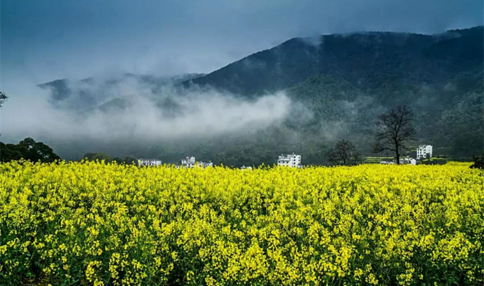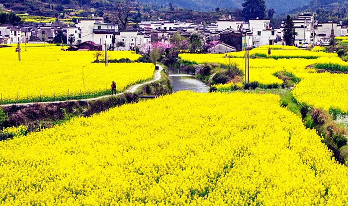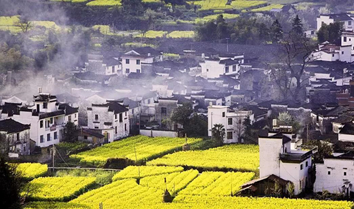成片的金黄色油菜花与粉墙黛瓦的徽民居