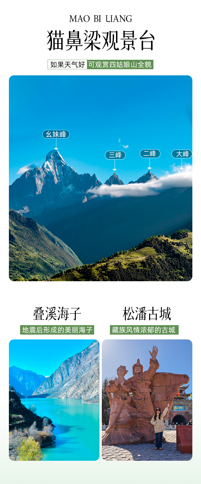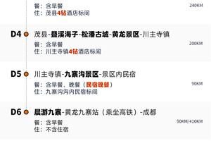 4、景交:卧龙中华大熊猫苑观光车20元/人(可选),四姑娘山双桥沟观光车70元/人(必须),黄龙索道上行80元/人(建议乘坐)+下行40元/人(可选)、黄龙观光车20元/人(可选),九寨沟观光车淡季80元/人、旺季90元/人(必须);