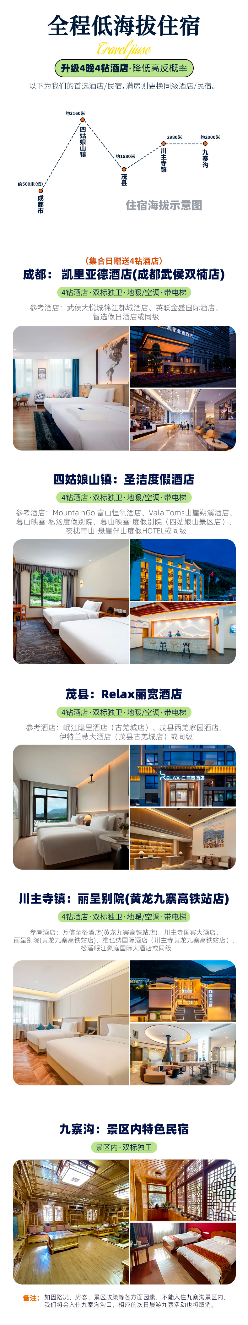 2、住宿:全程5晚标间住宿(升级4晚4钻酒店+1晚景区内民宿,含集合日1晚赠送酒店、不住不退);