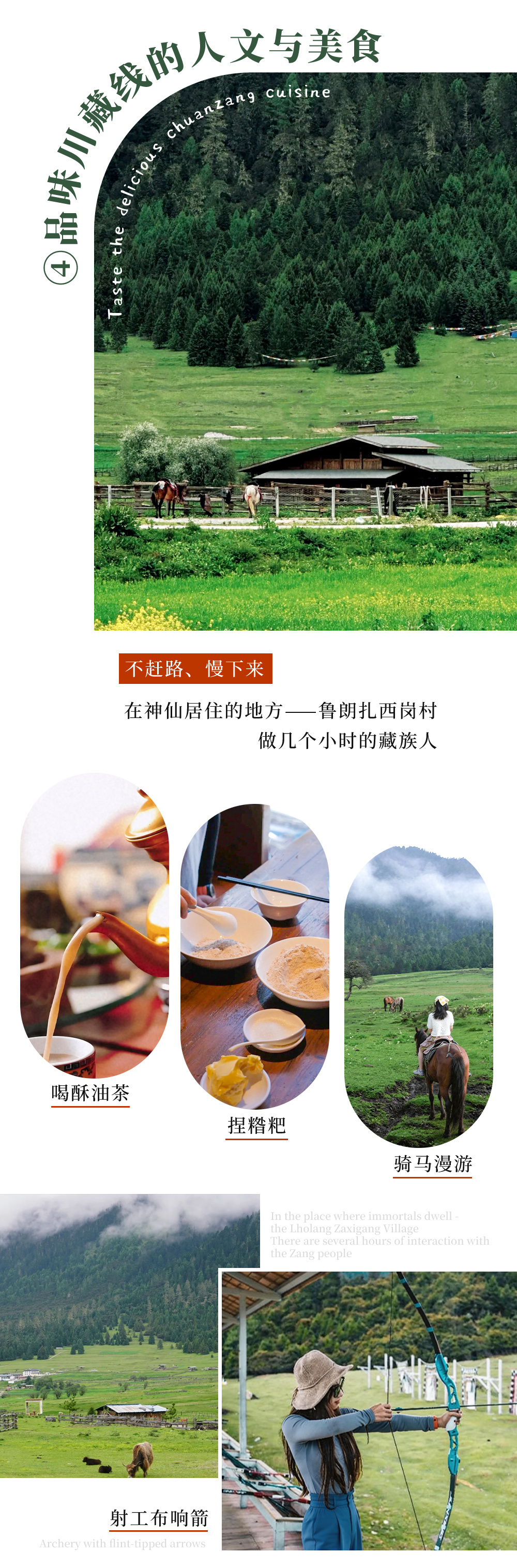 4、藏地人文体验:藏家主人献哈达+喝酥油茶+捏糌粑+骑马+射箭+挂经幡+撒隆达;