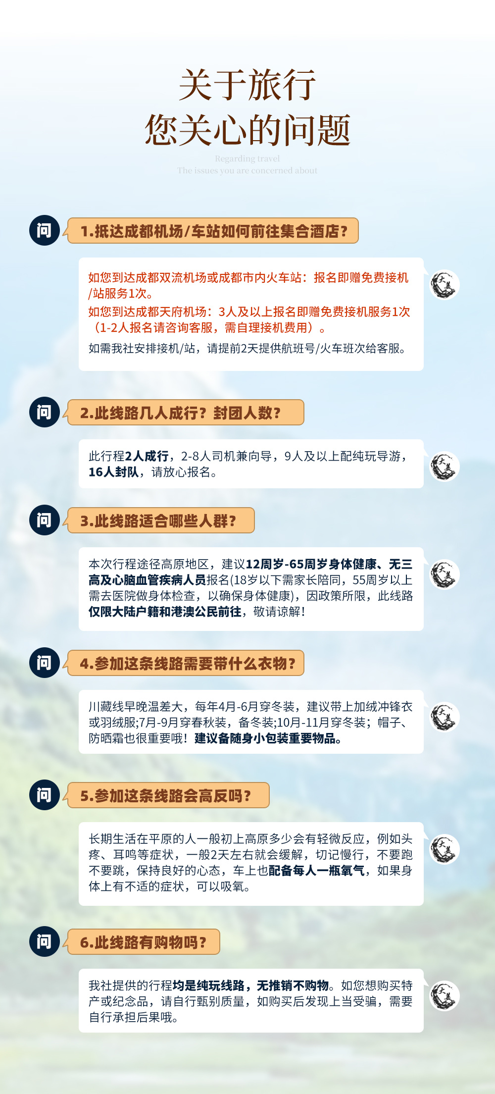 8、报名即赠成都双流机场接机/市内火车站接站(成都东站、成都南站、成都西站)1次,3人及以上报名赠成都天府机场接机1次。