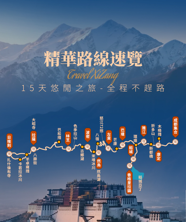 稻城亞丁+理塘·勒通古鎮+木格措+新都橋+然烏湖+米堆冰川+巴松措+布達拉宮+大昭寺+羊卓雍措+扎什倫布寺15日深度漫遊