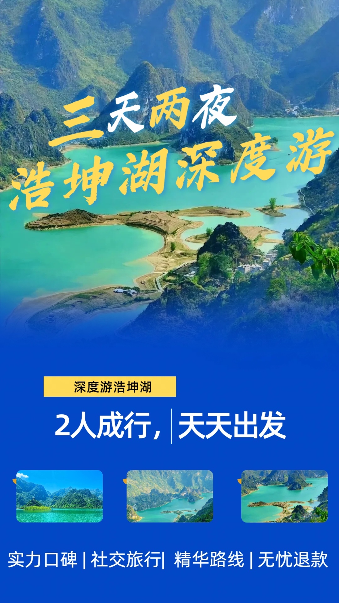 车程约1个半小时到达浩坤湖,入住浩坤湖酒店或民宿,如果当天下午有时间,可以在湖边走走,拍拍照。晚上大家可以AA结伴品尝特色农家菜。餐后可以一起观赏浩坤湖美丽的夜景。