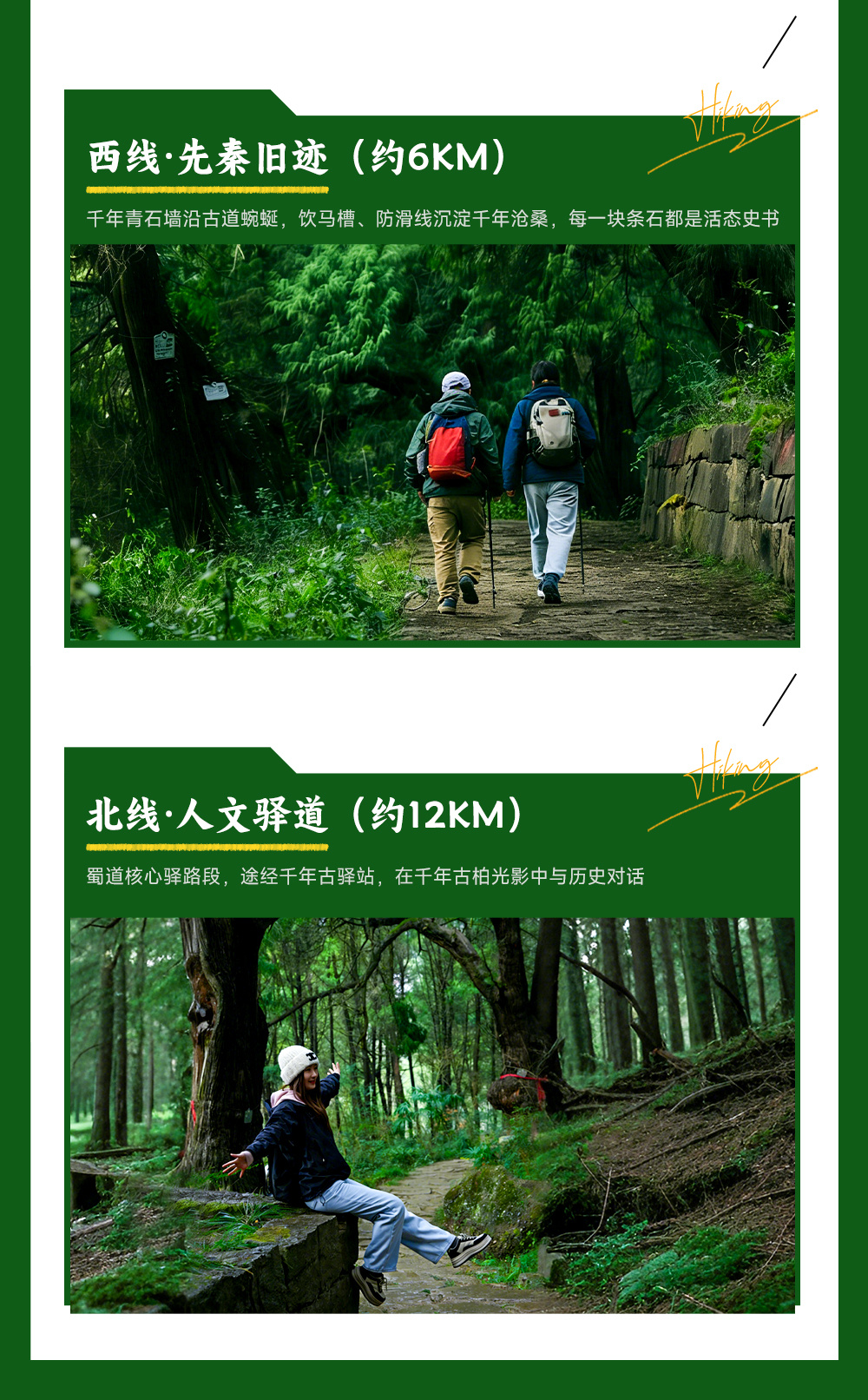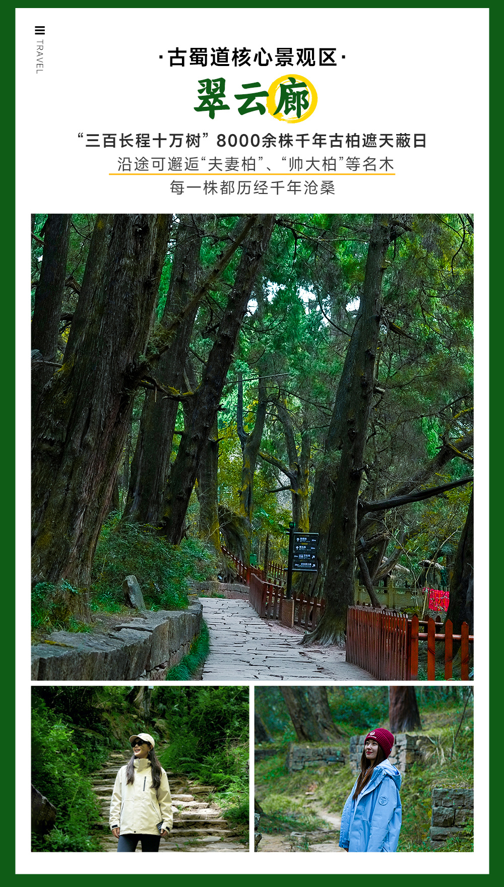 15:00左右徒步结束,我们坐车前往翠云廊景区(车程约10分钟,4公里)广义的翠云廊,是指以剑阁为中心,西至梓潼,北到昭化,南下阆中的三条路,总长约150公里,道路两旁栽种上千年的古柏,古树最早可追溯到秦汉时期,人称“三百长程十万树”。狭义的翠云廊古蜀道指翠云廊景区。【翠云廊景区】全球规模最大、保存最完好的人工古柏林,剑门蜀道的核心精华、国家 4A 级景区、国家级风景名胜区,有 “绿色长城”“蜀道灵魂” 之称。现存古柏:剑阁境内约 7800 余株,平均树龄超千年,其中剑阁柏 / 帅大柏树龄达 2300 余年,高 27 米,需 5 人合围~