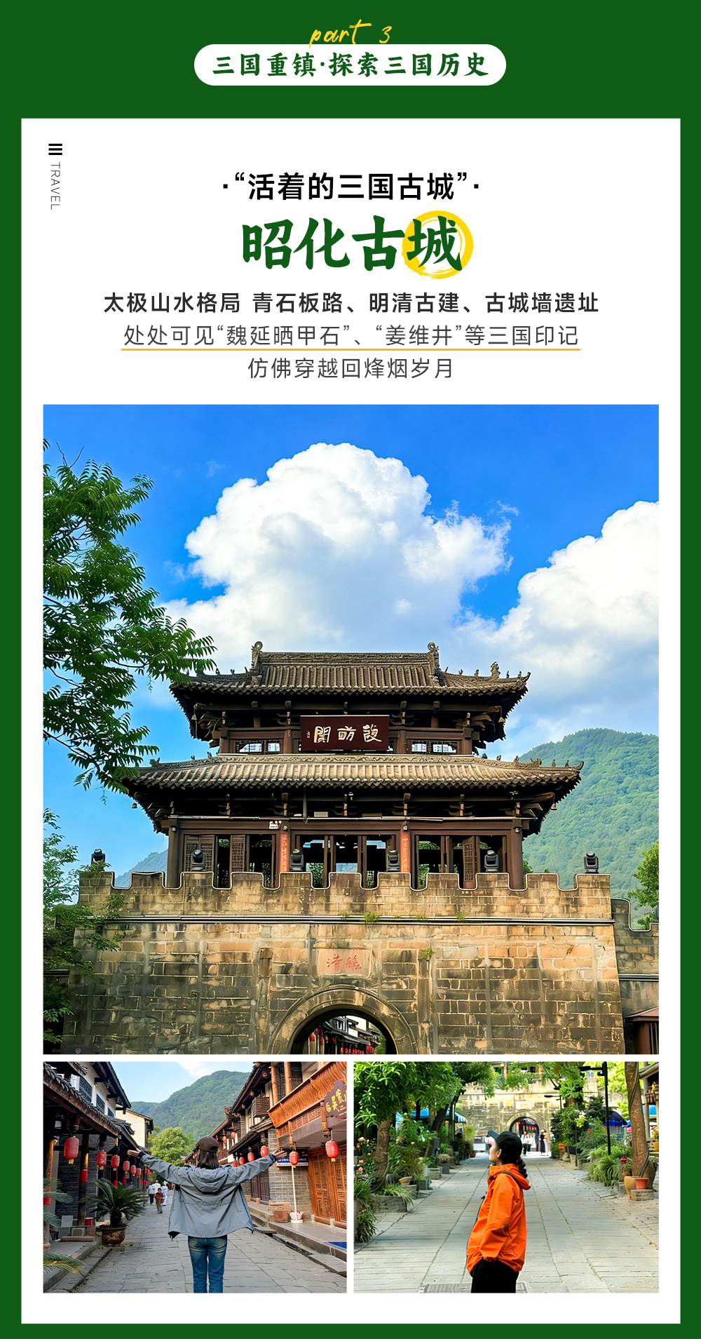 南门结束剑门关旅程后约13:00我们乘坐大巴前往昭化古城(车程约1小时,37公里)【昭化古城】古称葭萌,它是国内唯一保存完好的整座三国古城,有 “巴蜀第一县,蜀国第二都” 的美誉。距今2000多年历史,作为三国主战场,不少故事都在这里发生。张飞马超“挑灯夜战”、霍峻守城、姜维拜水等。现保留明清风格建筑群,四大街、五小巷,街巷之间”丁“字相连,还保留军事防御特色。