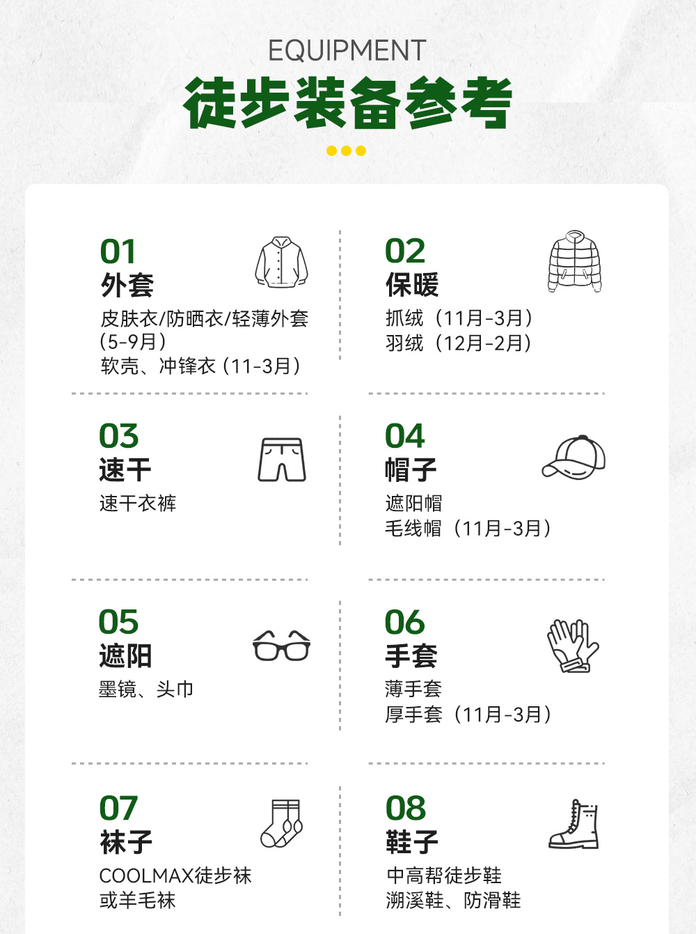①衣服:5/6月准备厚外套+羽绒服,穿长袖+长裤;7/8月防晒服+短袖即可,早晚准备秋季外套,9/10月准备秋季外套+羽绒服,沿途紫外线强记得带防晒霜和墨镜