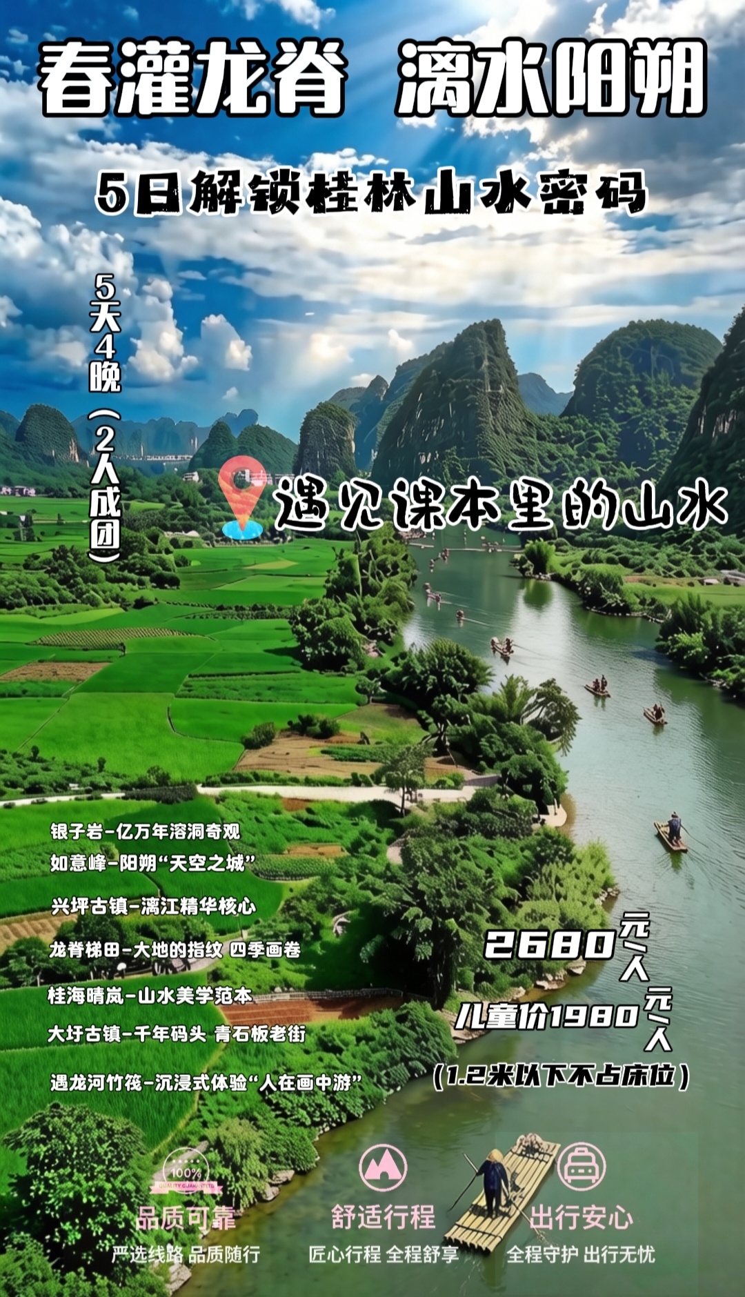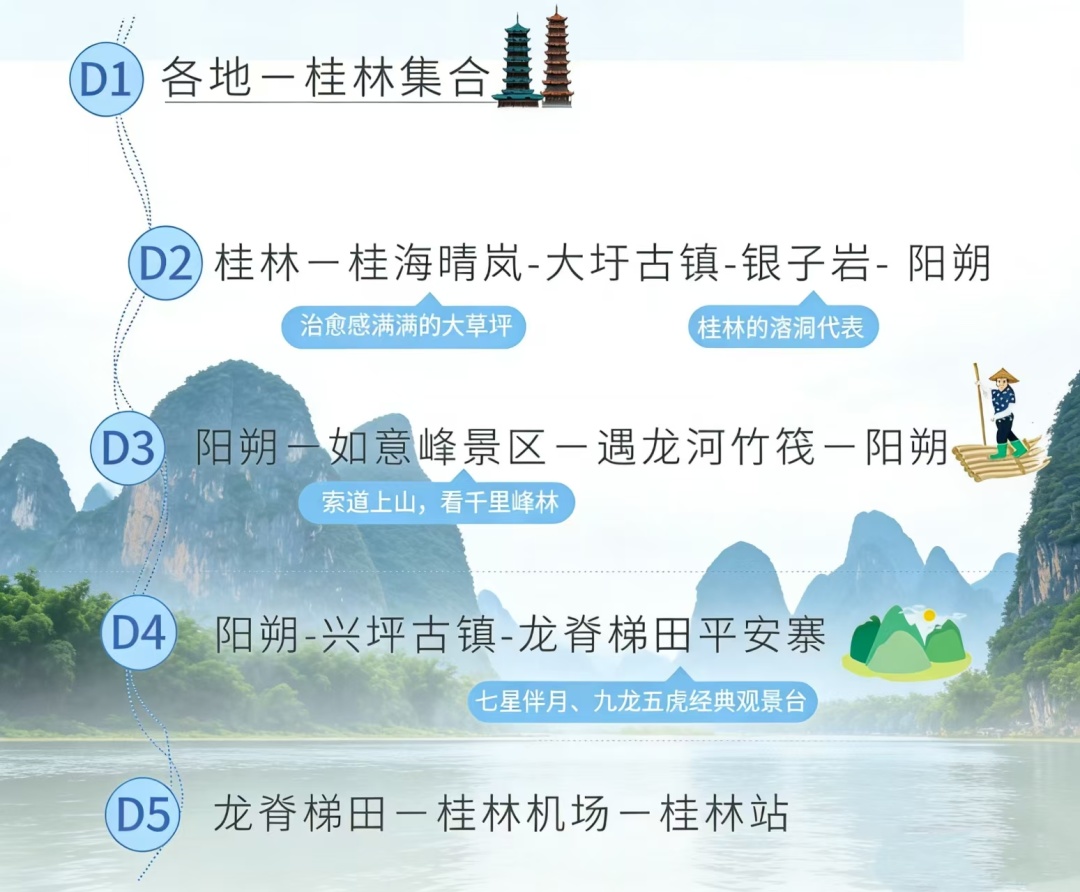 门票:桂海晴岚景区门票、遇龙河双人竹筏漂游、如意峰门票、银子岩门票、龙脊梯田门票、电动车;