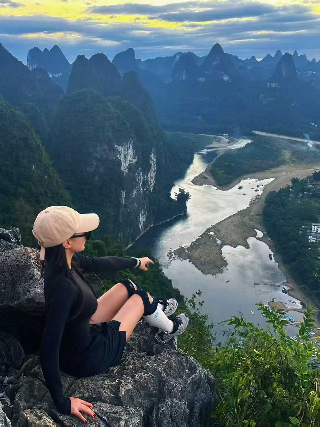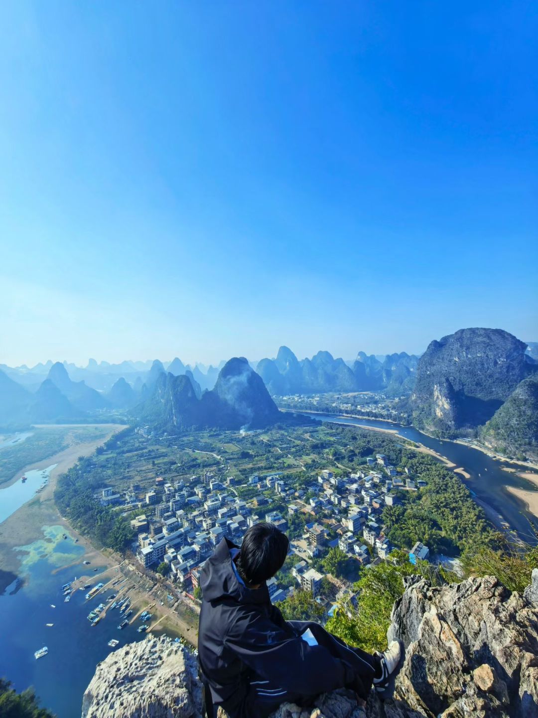 站在山顶观景台,只见漓江在此拐了一道优雅的“U”型大弯,群峰环抱,江水如练
