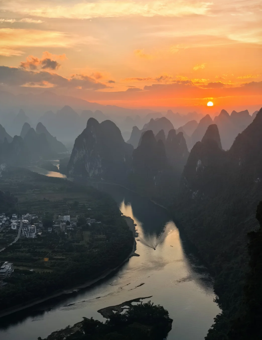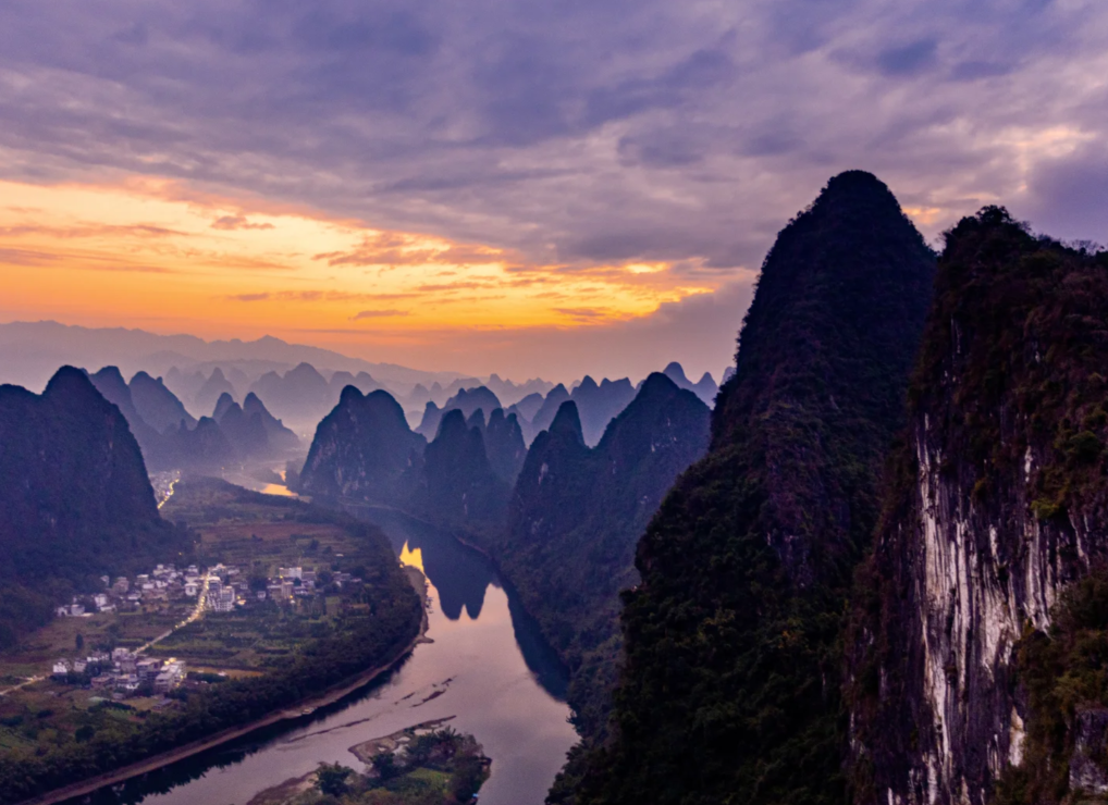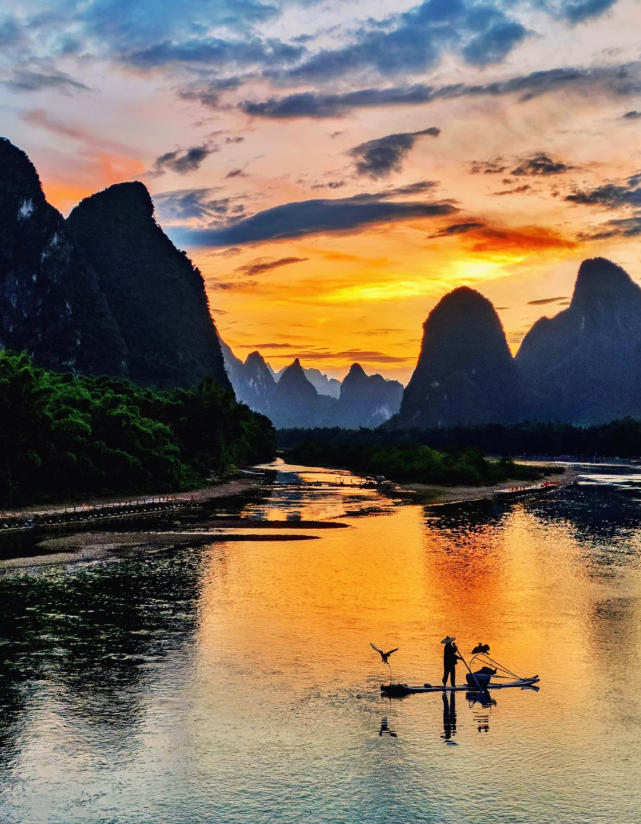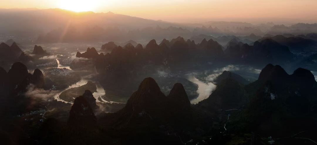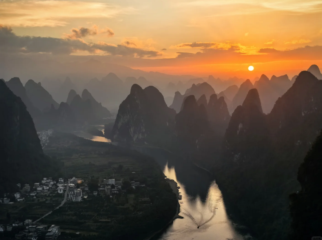 这里的日落被称为“漓江最美日落”——夕阳西下时,群峰层层叠叠,江水如练,光线在山峰间游走,真的像一幅流动的千里江山图