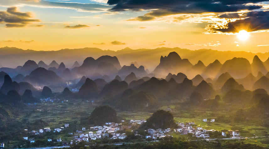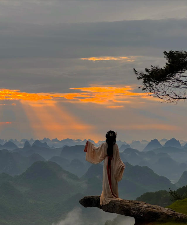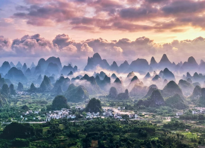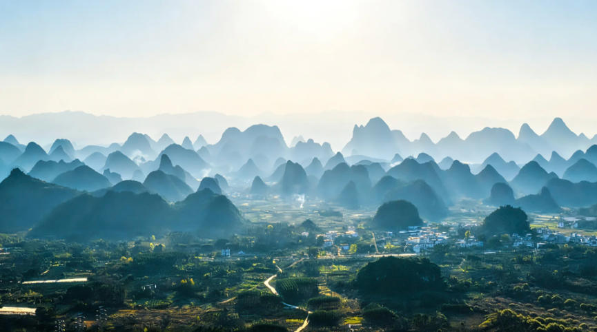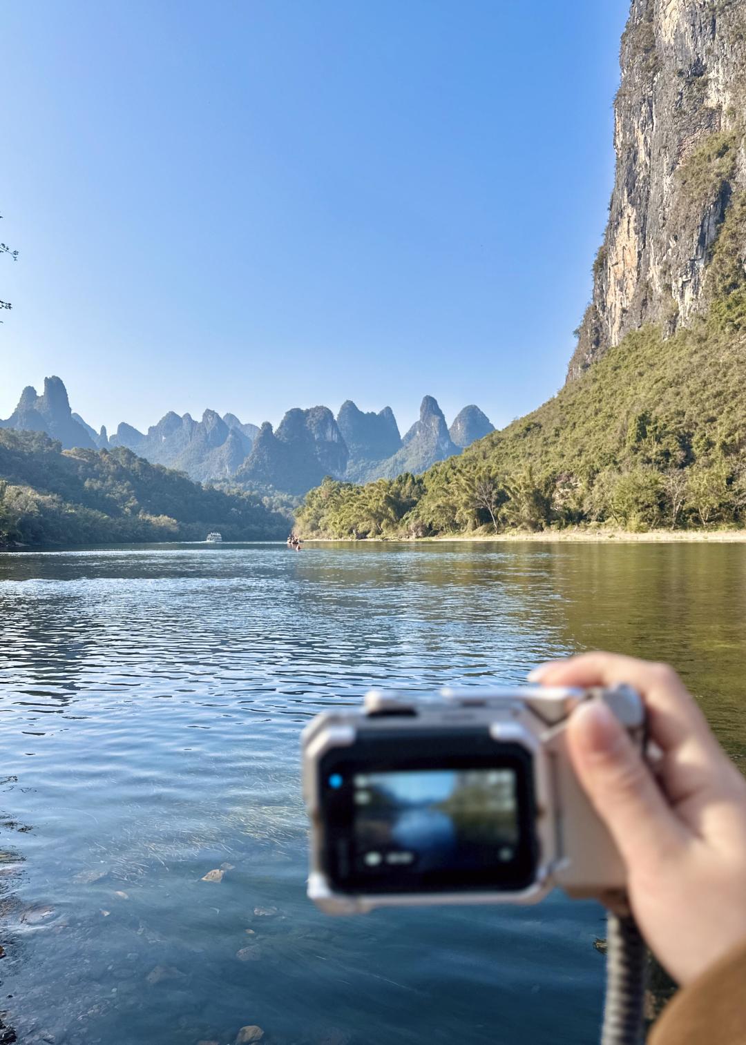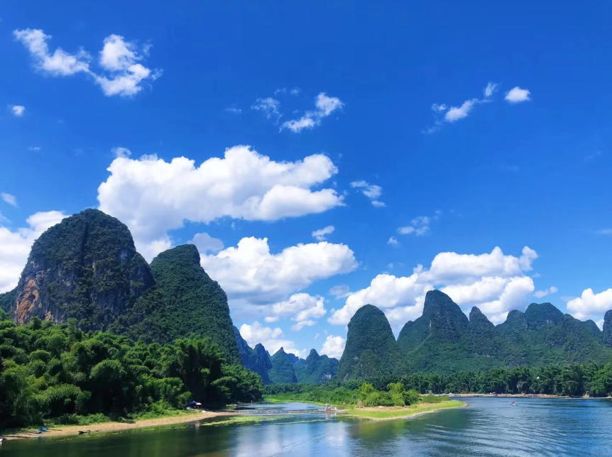 这里的日落被称为“漓江最美日落”——夕阳西下时,群峰层层叠叠,江水如练,光线在山峰间游走,真的像一幅流动的千里江山图