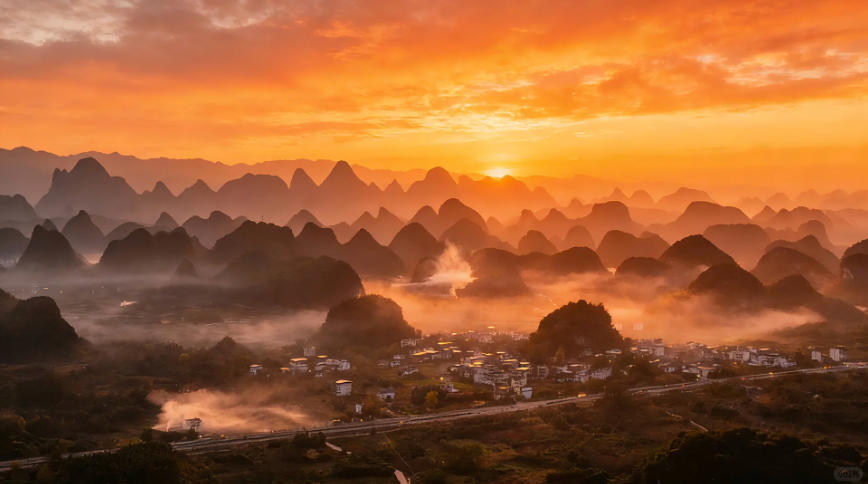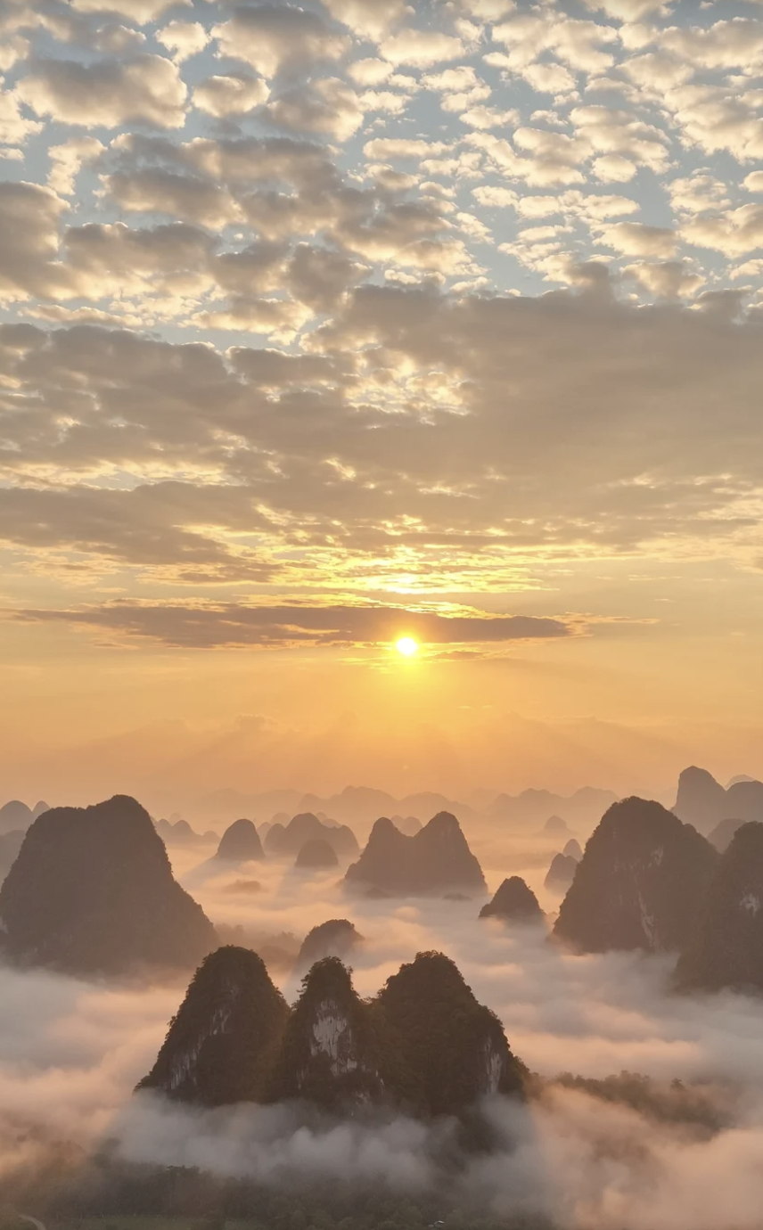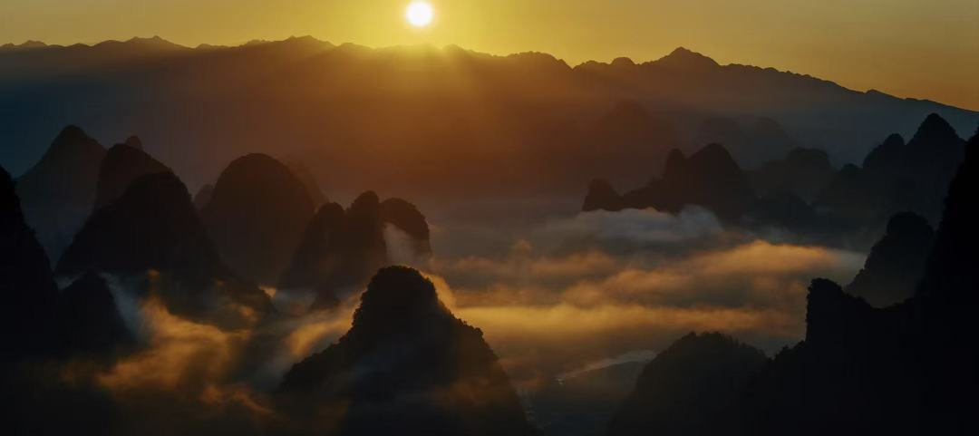 清晨时分,晨雾缭绕,云海翻腾,太阳从山后升起,金光洒在江面上,峰林与江水相映成趣,宛如一幅流动的千里江山图