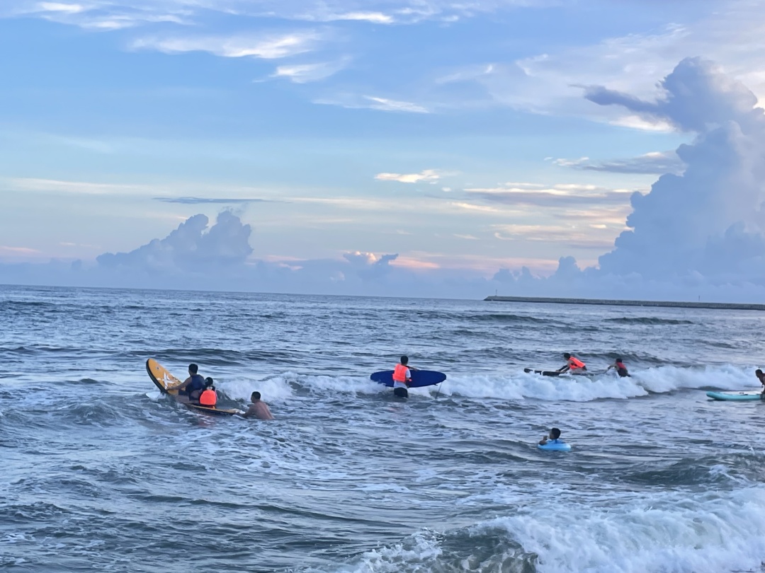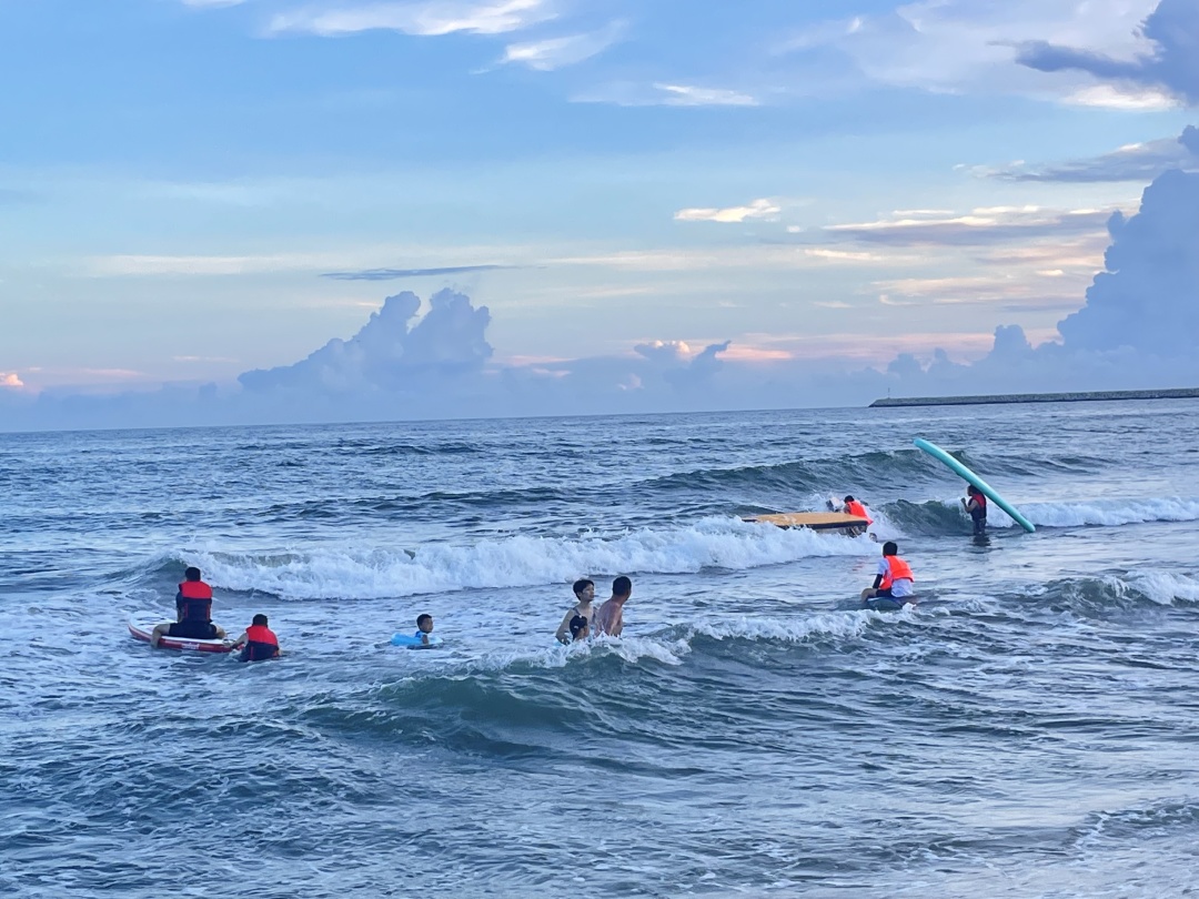 15:00 扎营结束,领取救生衣和冲浪板然后就可以去【海上冲浪】或者去【划浆板】,2-3人一块板有轮着玩(也会发放赶海小工具给到大家在沙滩上赶海)。