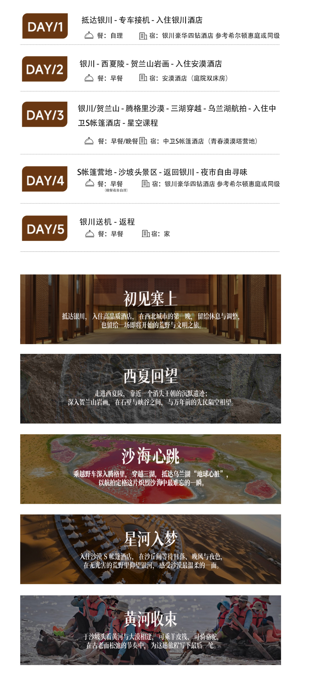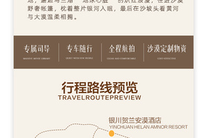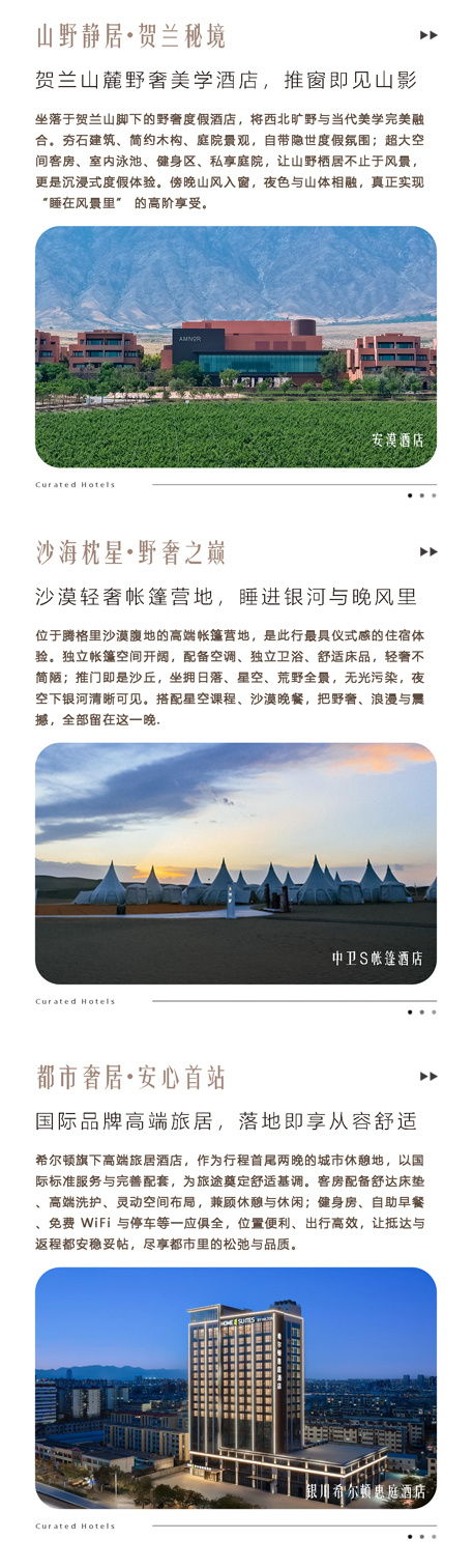 上午:清晨在酒店从容用早餐,整理行装。 根据航班时间,专车送往银川河东机场,结束这一程宁夏私家度假。 五天并不长,真正珍贵的,也从来不是“去了多少地方”。 而是你是否在一片土地上,真正慢下来过,安静停留过,被某些风景与片刻轻轻击中过。 当你离开宁夏时,带走的不只是照片,不只是一次沙漠穿越的记忆,也不只是贺兰山下与黄河之畔的风景。 更像是带走了一种久违的感受: 在荒野与文明之间,人是可以重新变得松弛、安静、开阔的。送机:根据航班时间,专车送往银川河东机场,结束这场野奢漫游。五天很短,但记忆很长。