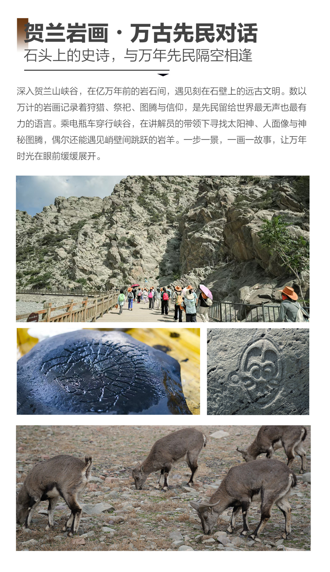 下午:前往【贺兰山岩画】。这里分布着数以万计的古代岩画,记录了远古先民狩猎、祭祀、舞蹈的生活场景,被誉为“石头上的史书”。乘坐电瓶车进入峡谷,在专业讲解的带领下,寻找那些刻在岩石上的太阳神、人面像、动物图腾,感受跨越万年的无声对话。运气好时,还能邂逅岩羊在峭壁间跳跃。