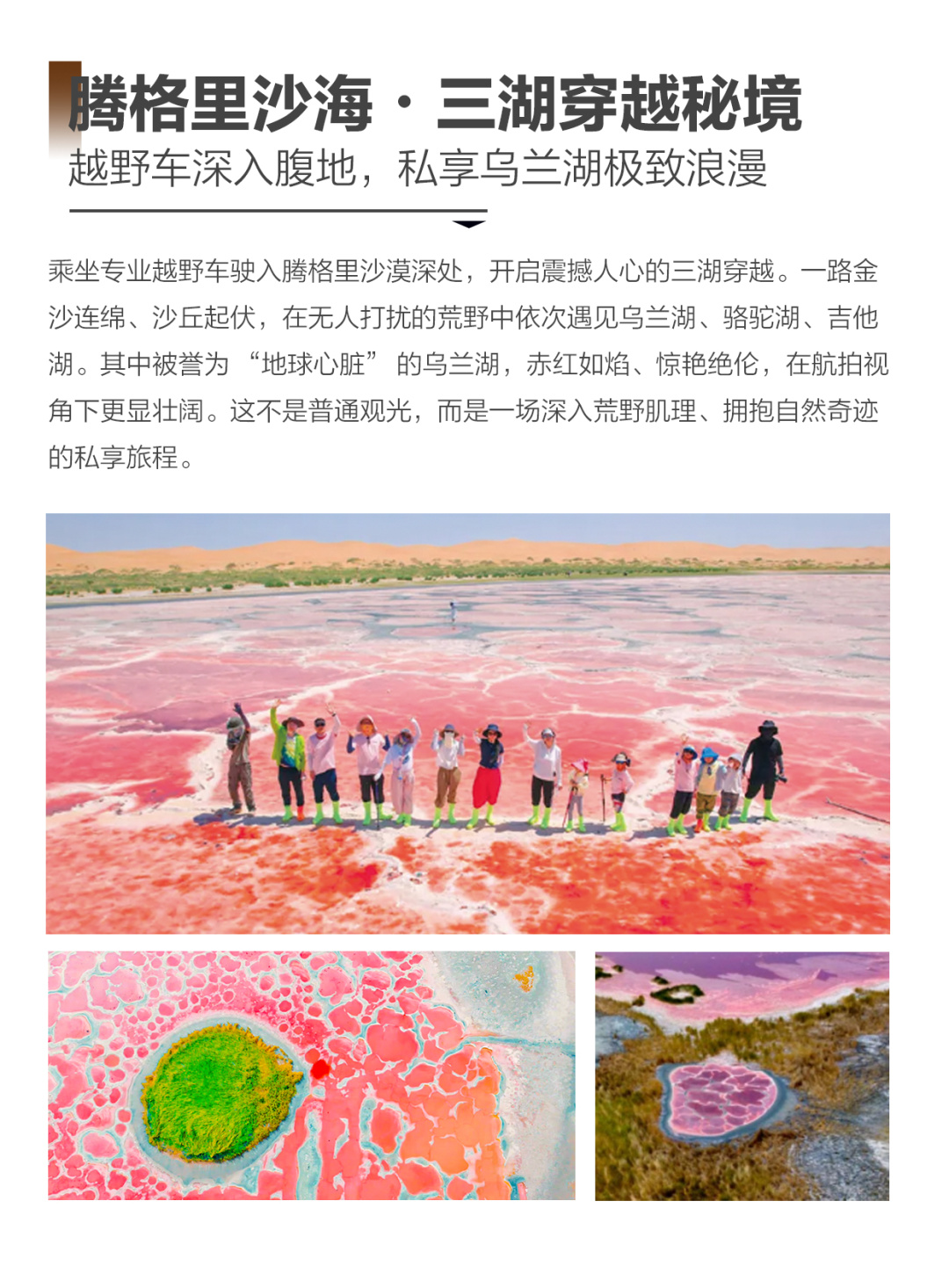 上午:早餐后,乘车前往腾格里沙漠方向。 当城市和山体逐渐退后,地貌开始变得开阔,风景也从文明遗迹,转入真正的荒野。 到达沙漠入口后,换乘专业越野车,开启腾格里三湖穿越。 腾格里,蒙古语意为“苍天”。它不是那种一眼就热闹起来的风景,而是一种会在行进中不断放大的辽阔。车队驶入沙海腹地,金色沙丘起伏连绵,轮胎卷起细沙,天地之间的边界开始变得简单而纯粹。 沿途穿越乌兰湖、骆驼湖、吉他湖。 三处湖泊像是沙海深处被悄悄藏起来的秘密。乌兰湖炽红如心,因此被许多人称为“地球心脏”;骆驼湖温润沉静,像一块镶嵌在沙中的翠色宝石;吉他湖则因为独特轮廓而多了几分浪漫意味。 这一路不是普通的观光,更像一次对荒野内部纹理的靠近。 在乌兰湖最佳观景区域,安排无人机航拍。 当镜头从高处俯瞰,赤红色湖面与金色沙丘交织在一起,那种震撼不是照片可以完全说明的。它更像这趟旅程的情绪高点——辽阔、炽烈、罕见,也足够值得被记住。