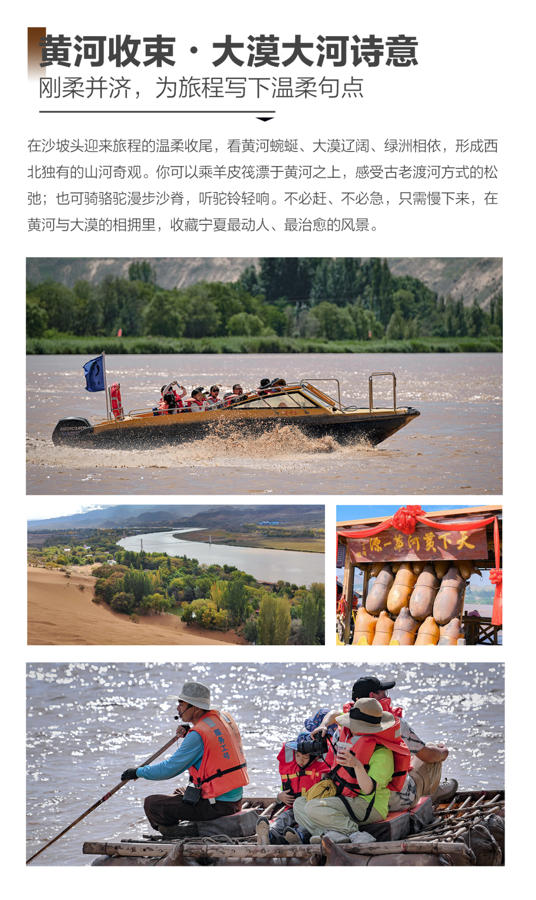 下午,景区内可根据个人喜好,自愿自费体验羊皮筏子或骑骆驼等项目。