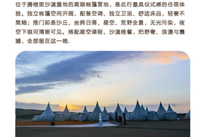 晚餐:营地内享用自助晚餐。炭火升起,肉香弥漫,星空渐显。您可以和新认识的朋友碰杯,分享今日的震撼与感动;也可以独坐一旁,听风声掠过沙丘,看星河慢慢铺满整个夜空。
