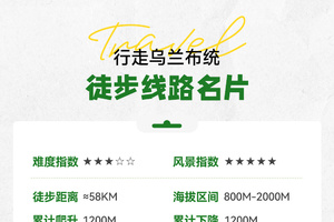 今日徒步为穿越路线,全程约16公里,累计爬升450米,累计下降820米,徒步平均用时约6-7个小时,为初级难度。