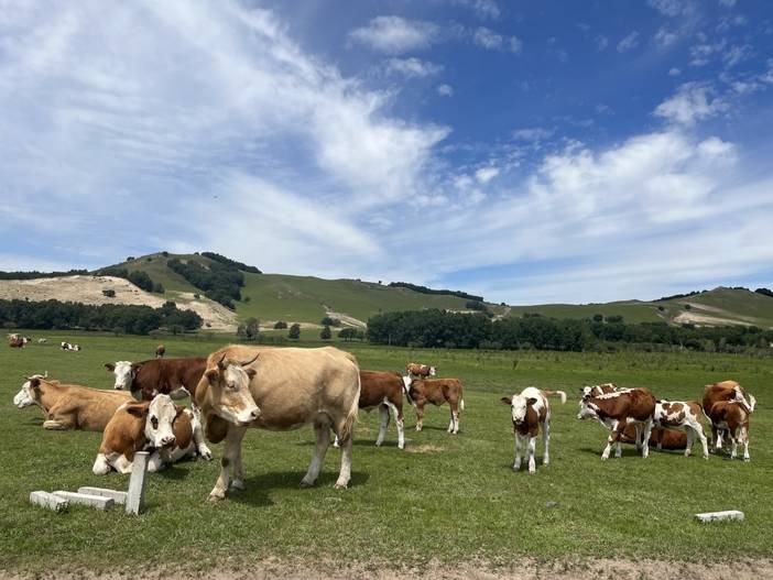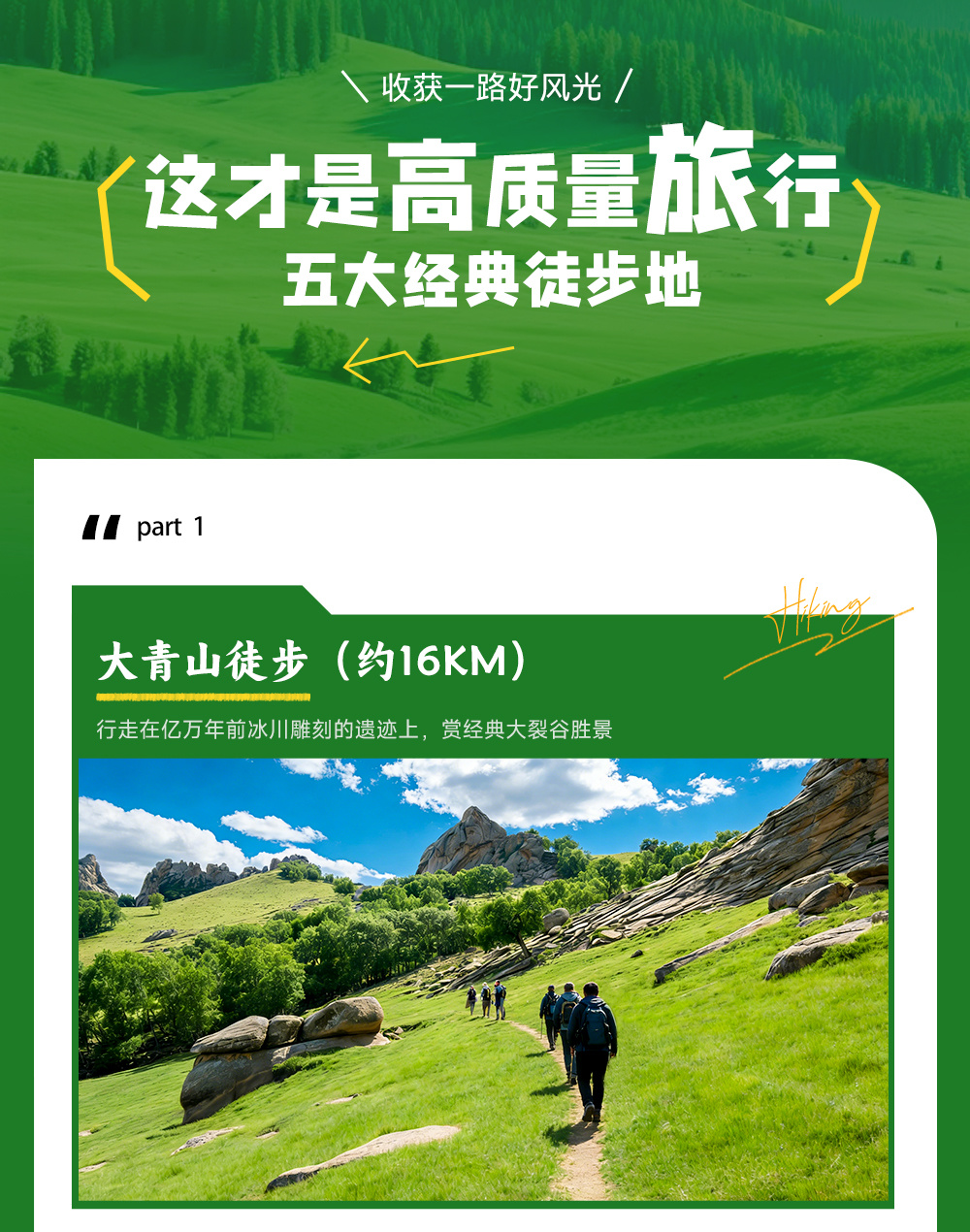 早餐后,乘车前往【大青山】(车程约3h,约230km),开始今天的徒步旅程(徒步约16km),被誉为“天然地质博物馆”的大青山,是第四纪冰川遗址,以其主峰近千米的海拔,更添几分壮美与雄浑。村口土路出发,沿溪流草甸缓行,脚下是松软草甸与碎石小径,沿途奇石错落、溪流潺潺,牛羊悠然散落,山野气息扑面而来。山谷里牛羊成群,自然和谐,网红大裂缝深邃如火星表面,草甸与峡谷交织成电影级画面!穿越亿万年地质奇观,随手一拍就是《星际穿越》同款大片!