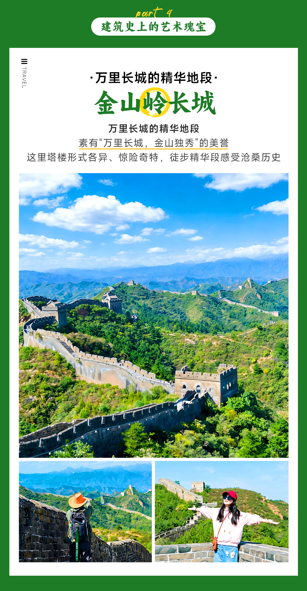 早餐后,乘车前往素有“万里长城,金山独秀”之称的【金山岭长城】(徒步全程6KM),金山岭长城始建于明洪武元年,西望古北口,东连司马台,此时的金山岭长城内外百花争艳,云海飘渺浩瀚,更添气势。【注意:在金山岭长城不想徒步的话,也可以选择「休闲游」自行游览】